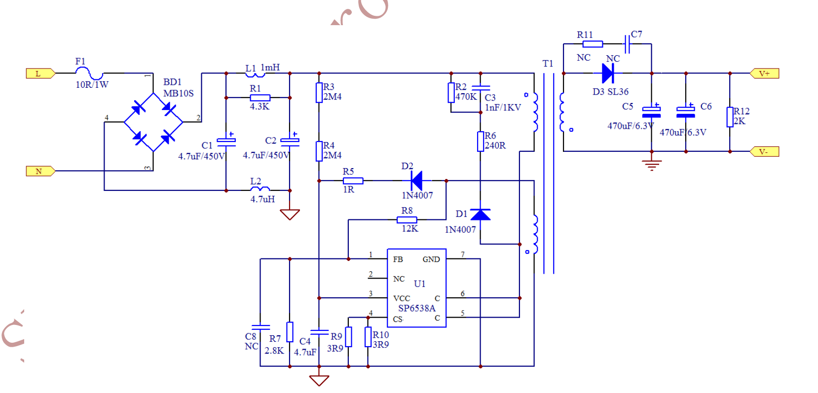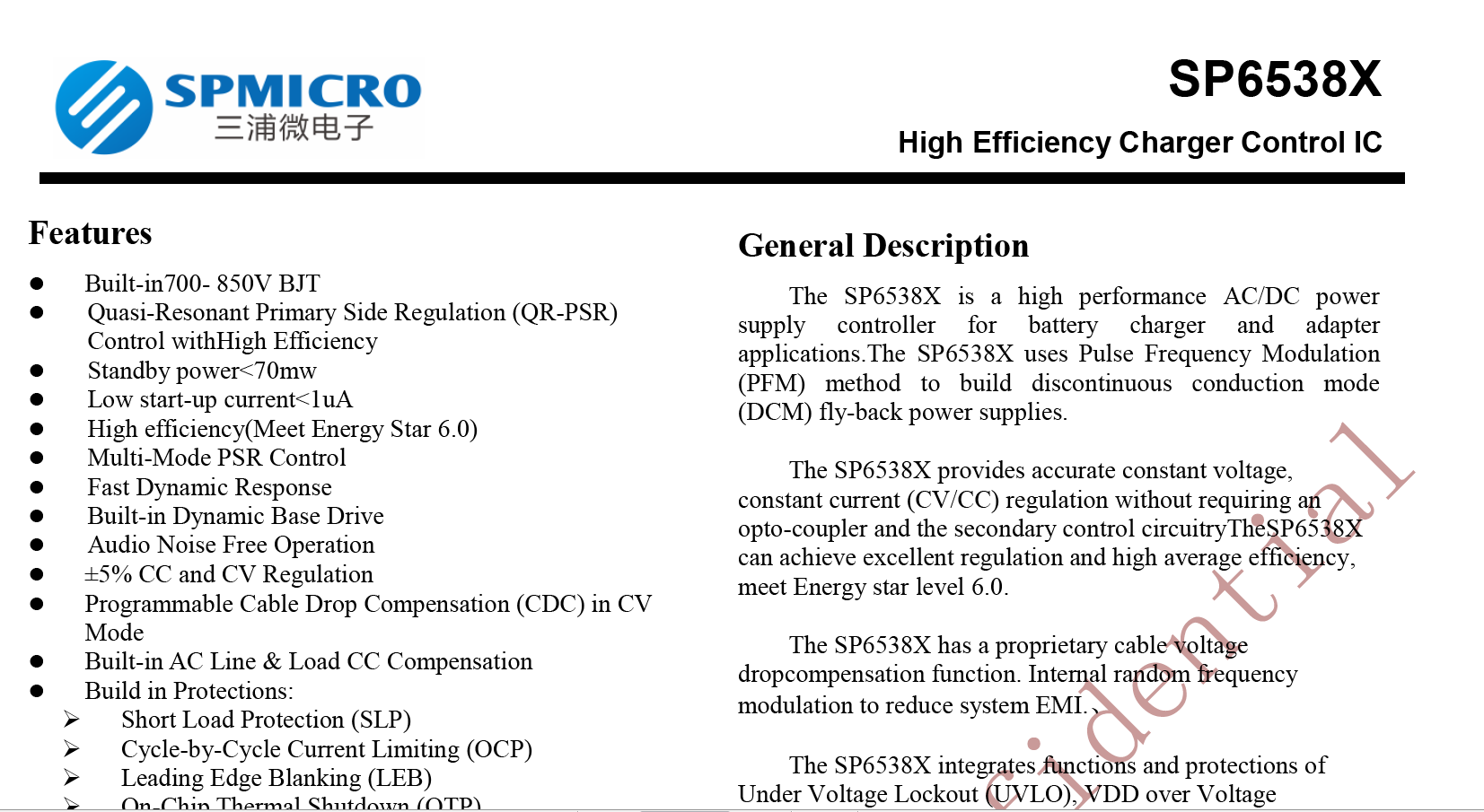 型号:SP6538A 封装:SOP-7 内置功率管: 800V/0.3A BJT 应用: 5V/0.6A型号:SP6538B 封装:SOP-7 内置功率管: 800V/1.5A BJT 应用: 5V/1A型号:SP6538C 封装: SOP-7 内置功率管: 800V/3A BJT 应用:5V/2A 型号:SP6538D封装:DIP-7 内置功率管:800V/4A BJT 应用:5V/2.4A&12V/1A